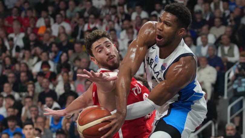 Turkey’s power forward #23 Alperen Sengun (L) and Greece’s small forward #34 Giannis Antetokounmpo vie for the ball during the FIBA EuroBasket 2025 semi-final basketball match between Greece and Turkey in Riga, Latvia, on September 12, 2025.