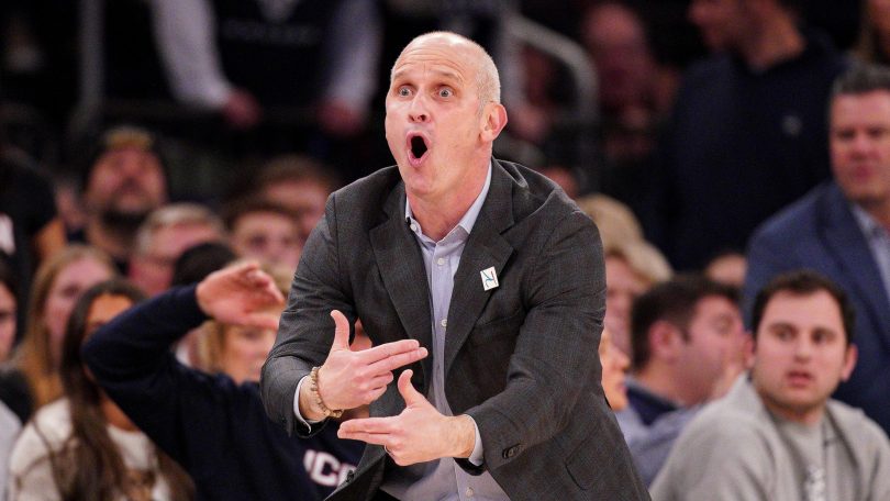 NEW YORK, NEW YORK – DECEMBER 09: Head Coach Dan Hurley of the UConn Huskies reacts during the game against the Florida Gators at Madison Square Garden on December 09, 2025 in New York City. (Photo by Evan Bernstein/Getty Images)