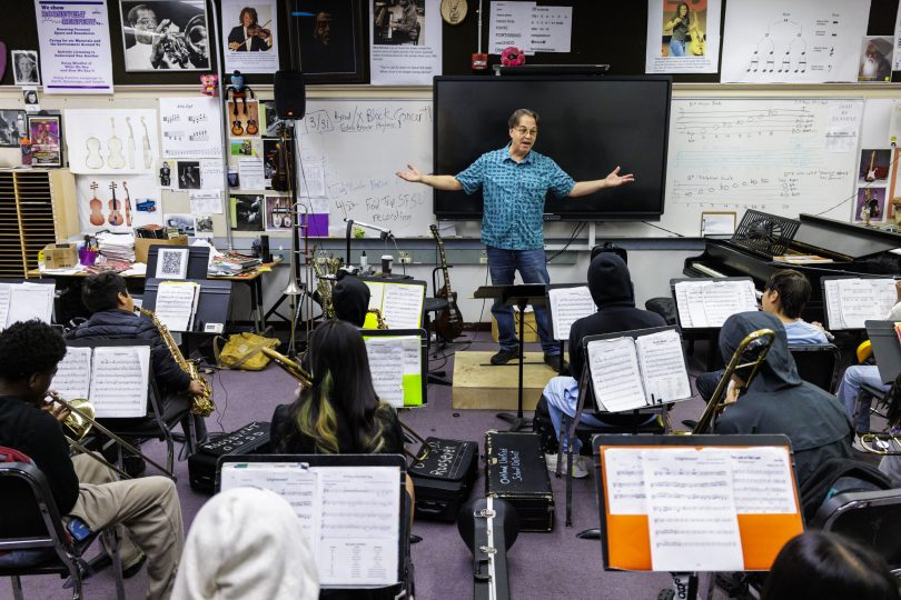 Some of Porter’s former students have gone on to new heights, like 10th grade student Ryan, who comes back to Porter’s classroom at Roosevelt every Thursday to mentor middle schoolers. When Ryan arrived in Porter’s classroom about five years ago, he had experience playing violin and had picked up the cello. But Porter’s jazz-filled band class presented something new.