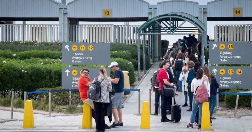 Passengers wait in line between the terminal building and outdoor boarding gates at Paphos International Airport in Paphos, Cypr